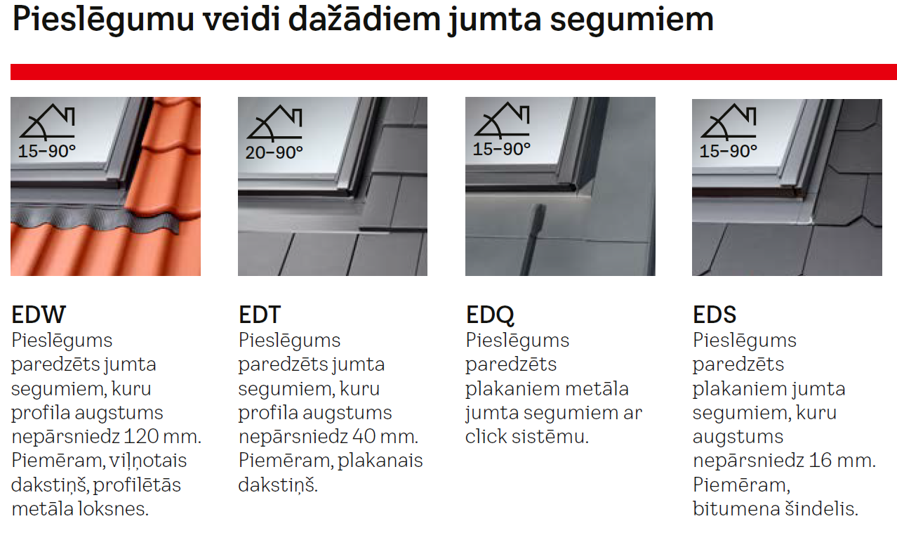 VELUX jumta logu pieslēgumi nodrošina hermētisku savienojumu ar jumta segumu.